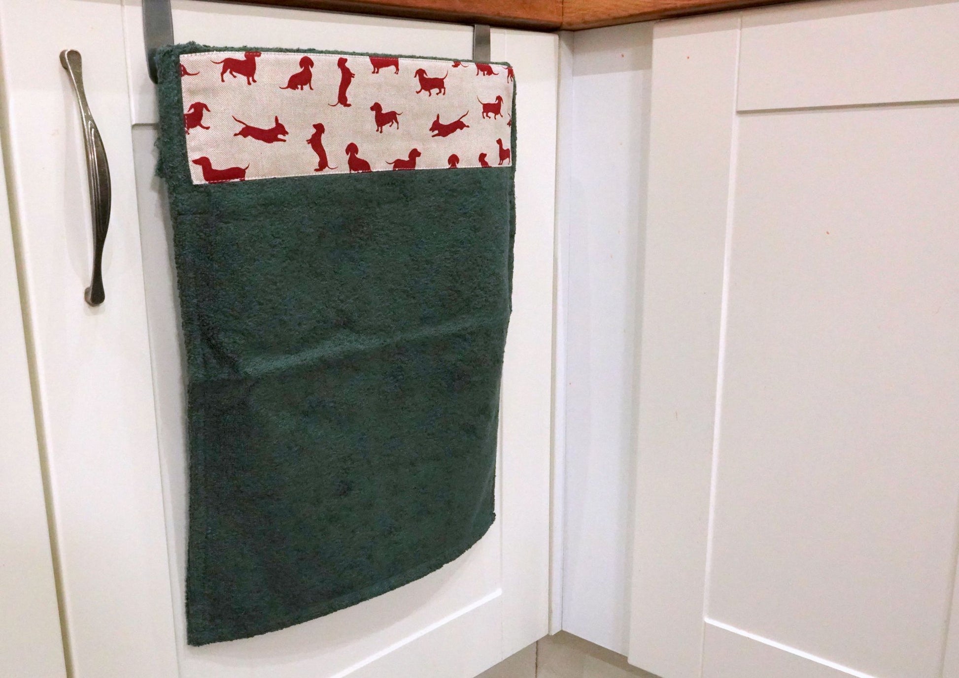 This towel features a charming Red Dachshund design and is part of the coordinating collection. Available in Navy Blue, Black, or Green, it combines functionality with a pop of colour in your kitchen.